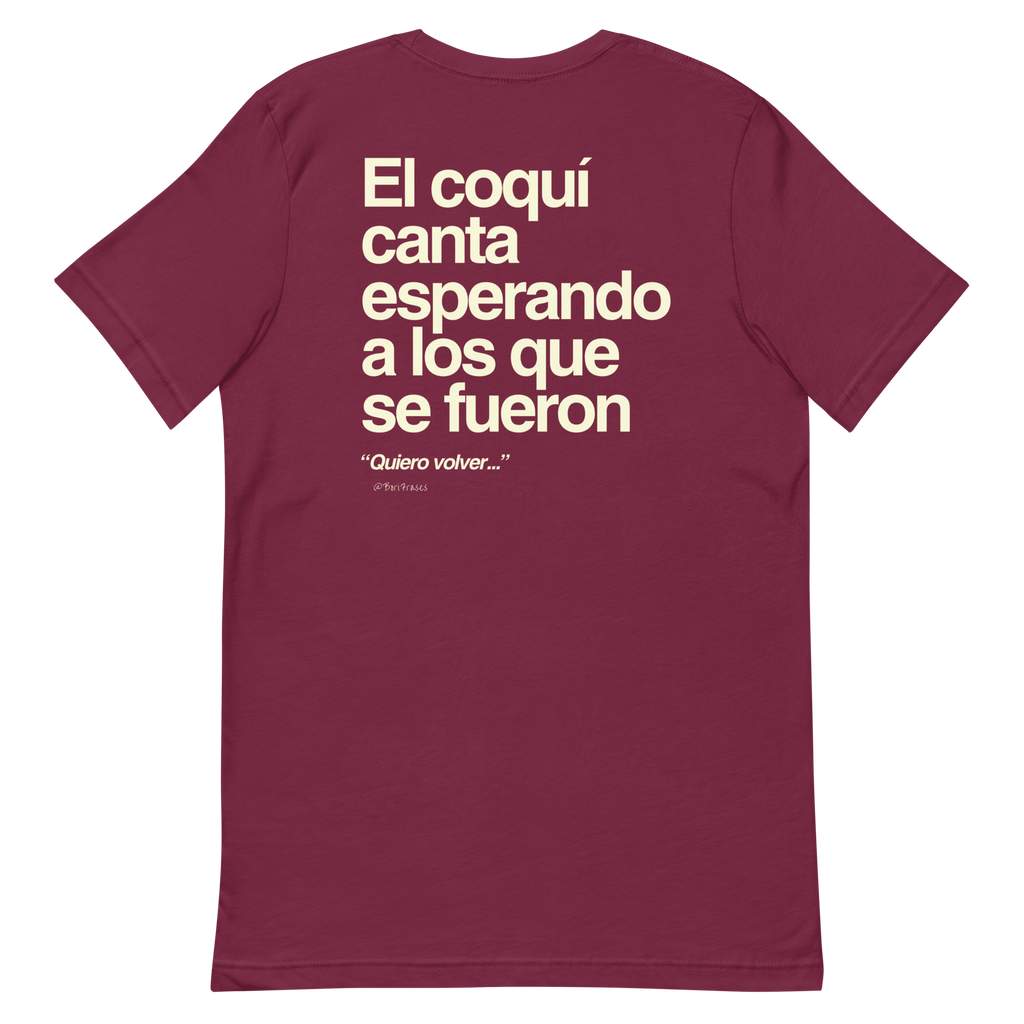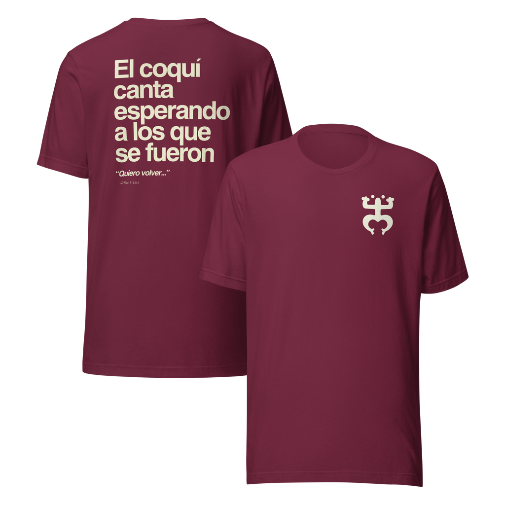 Camisa (t-shirt) hecha para boricuas en Puerto Rico y la diáspora, evocando el canto del coquí taíno y el deseo de regresar a la Isla del Encanto.